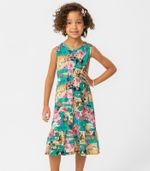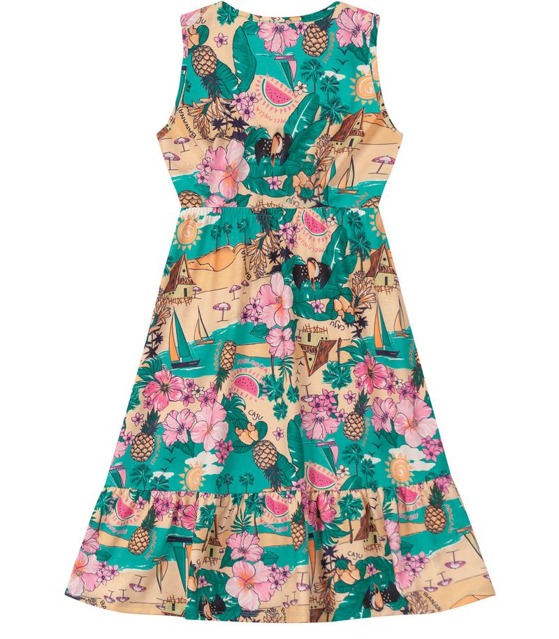 Vestido Infantil desenvolvido em Malha Polytouch com estampa rotativa no tema praia. Modelo sem mangas, com decote redondo. Possui elástico na cintura e recorte levemente franzido na barra. Comprimento abaixo do joelho. Peça confortável e estilosa, ideal para passeios ao ar livre! Combine com: tênis e jaqueta jeans.