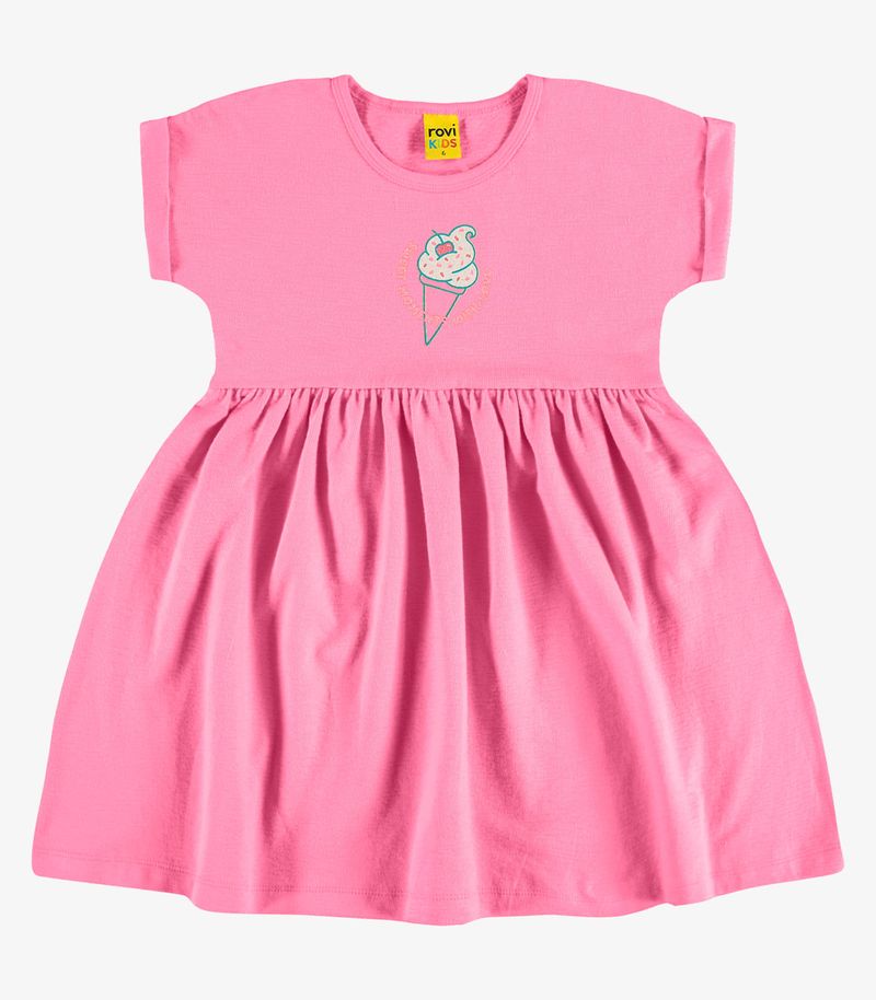 Vestido feminino Rovikids confeccionado em Malhão Fruit, com toque leve e confortável para o dia a dia. Possui gola com acabamento em friso FCB06B, mangas dobradas com travetes para maior firmeza e estilo, além de estampa divertida na parte frontal. A cintura tem recorte com franzido e elástico embutido, garantindo um caimento soltinho e ajustado. A barra é finalizada com bainha dupla. Ideal para compor looks alegres e práticos para as meninas.