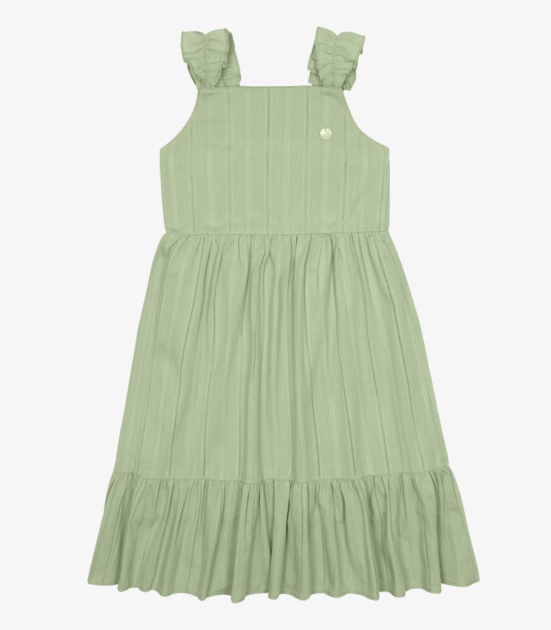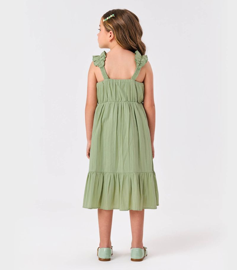 Vestido midi confeccionado em tricoline listrada maquinetada, combinando sofisticação e frescor. Suas alças bordadas adicionam um charme especial, enquanto o forro garante conforto e um caimento impecável. O babado franzido na barra traz movimento e delicadeza à peça. Para um toque refinado, conta com uma plaquinha de madrepérola. Versátil e elegante, é ideal para diversas ocasiões, desde eventos casuais até produções mais elaboradas.
